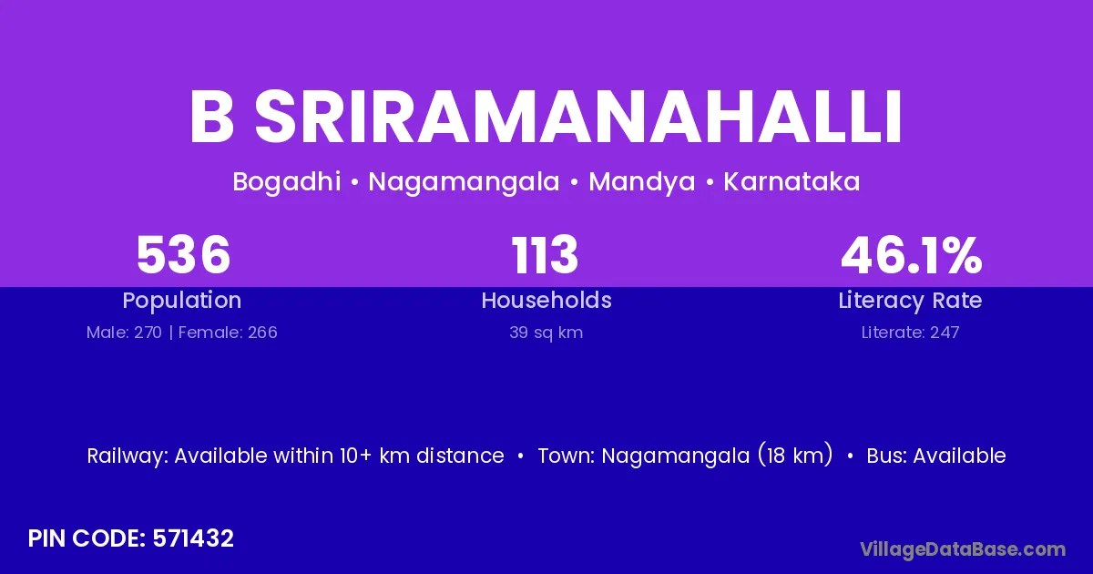 Nagamangala (18 km) is the nearest town to B Sriramanahalli village for major economic activities and is located approximately 18 km away.