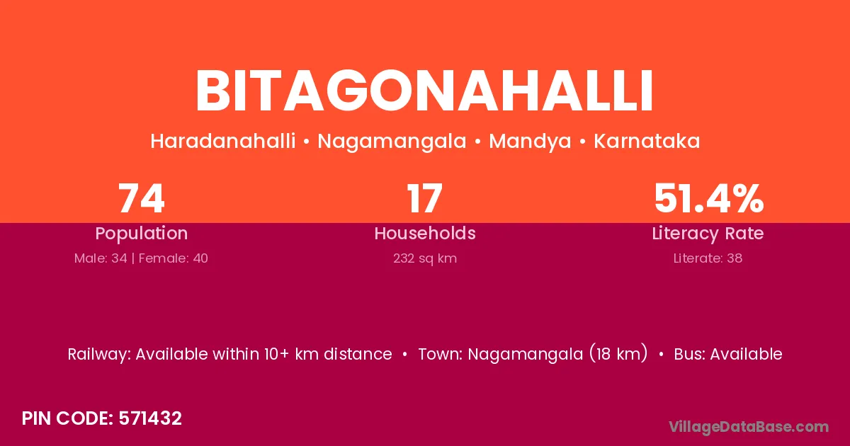 Nagamangala (18 km) is the nearest town to Bitagonahalli village for major economic activities and is located approximately 18 km away.