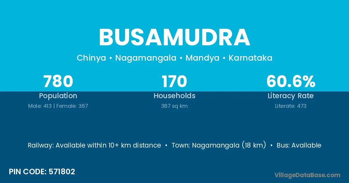 Nagamangala (18 km) is the nearest town to Busamudra village for major economic activities and is located approximately 18 km away.