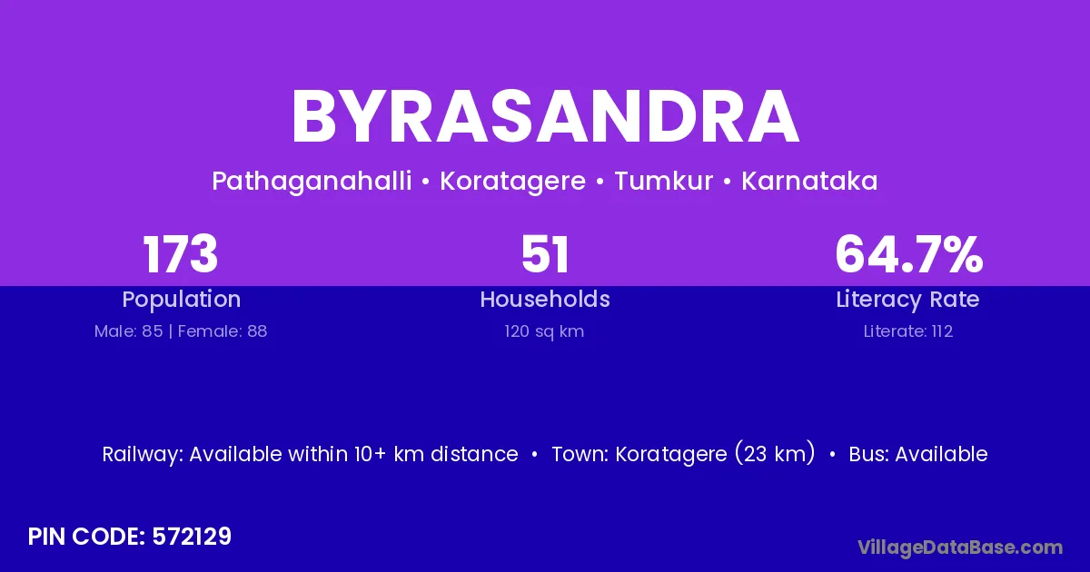 The literacy rate of Byrasandra village is 62.54%. Male literacy stands at 81.02% and female literacy at 45.21%.