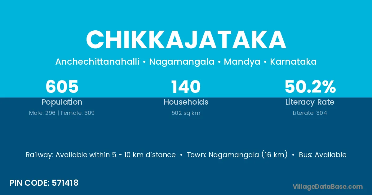 Nagamangala (16 km) is the nearest town to Chikkajataka village for major economic activities and is located approximately 16 km away.