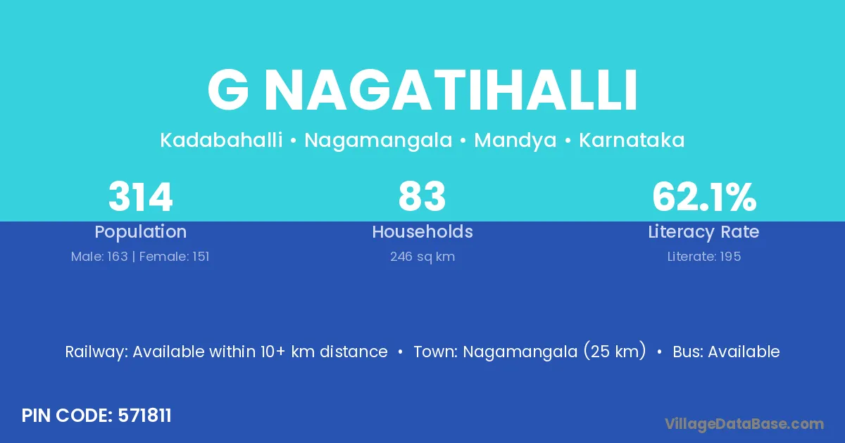 Nagamangala (25 km) is the nearest town to G Nagatihalli village for major economic activities and is located approximately 25 km away.