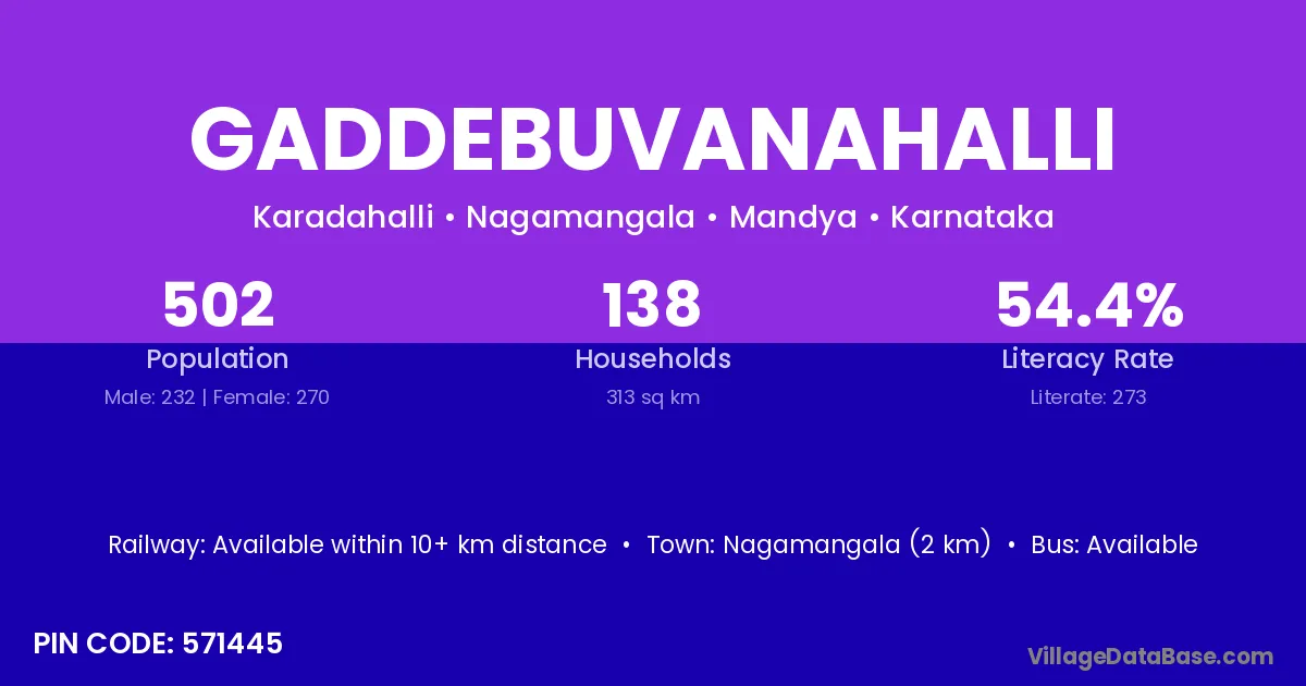 Nagamangala (2 km) is the nearest town to Gaddebuvanahalli village for major economic activities and is located approximately 2 km away.