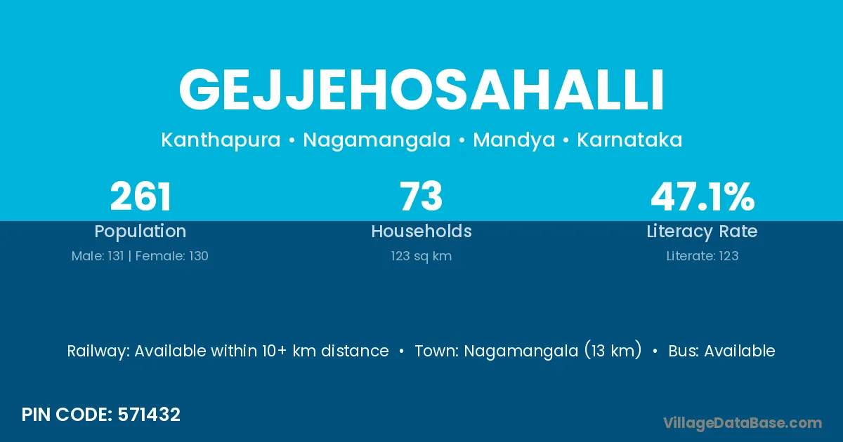 Gejjehosahalli village has a total population of 261 people, of which 131 are males and 130 are females.