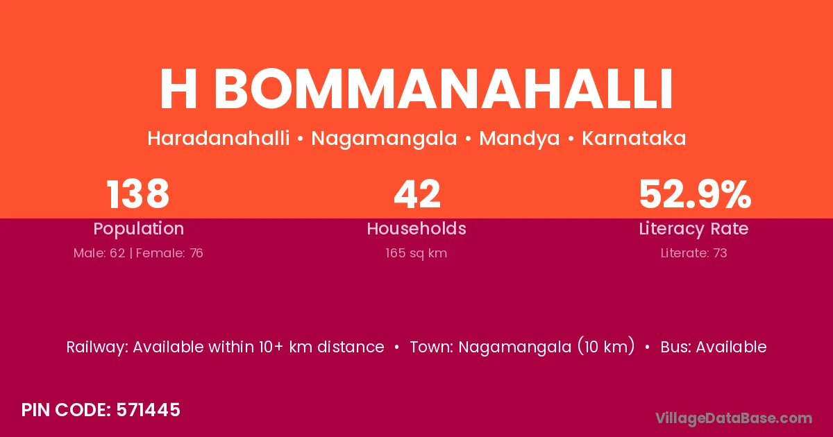 H Bommanahalli village has a total population of 138 people, of which 62 are males and 76 are females.