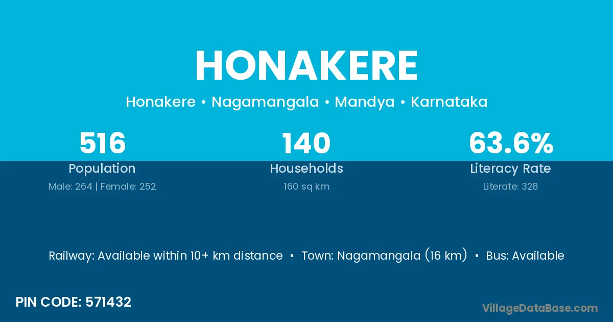 Nagamangala (16 km) is the nearest town to Honakere village for major economic activities and is located approximately 16 km away.