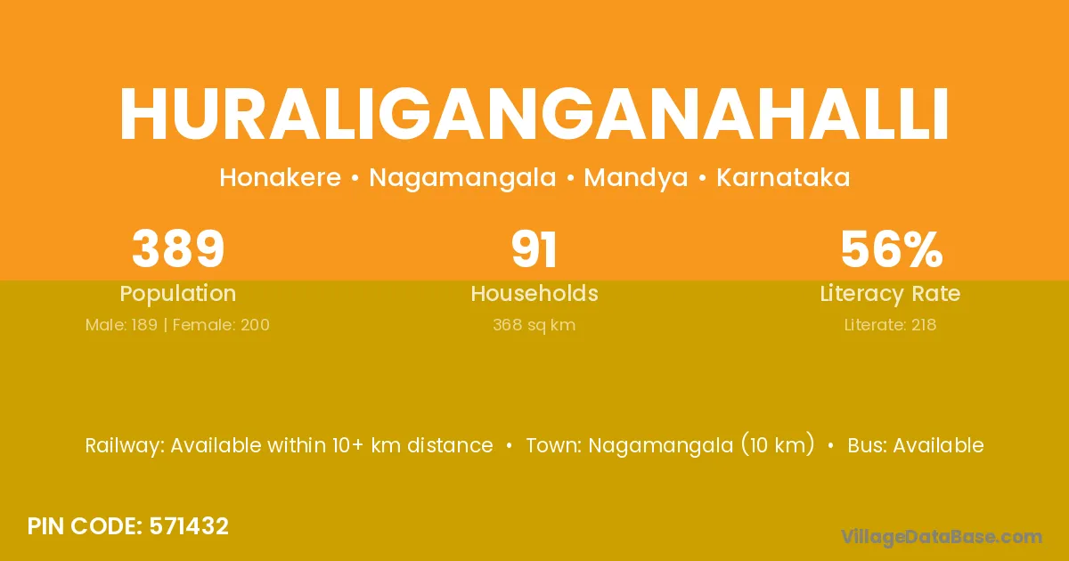 Nagamangala (10 km) is the nearest town to Huraliganganahalli village for major economic activities and is located approximately 10 km away.
