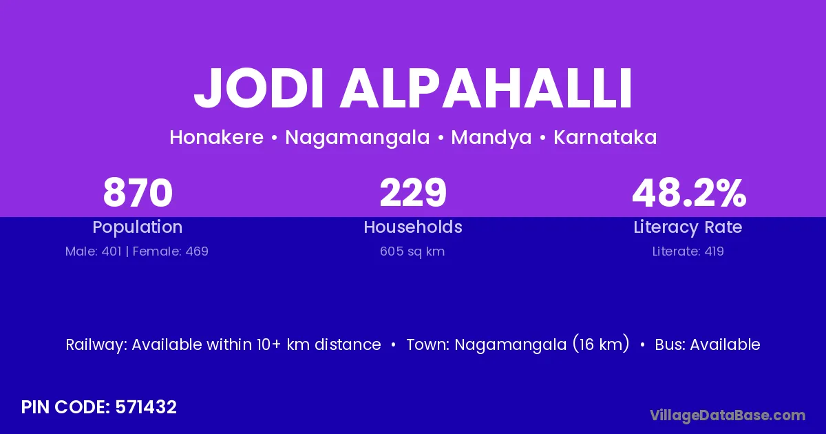 Nagamangala (16 km) is the nearest town to Jodi Alpahalli village for major economic activities and is located approximately 16 km away.
