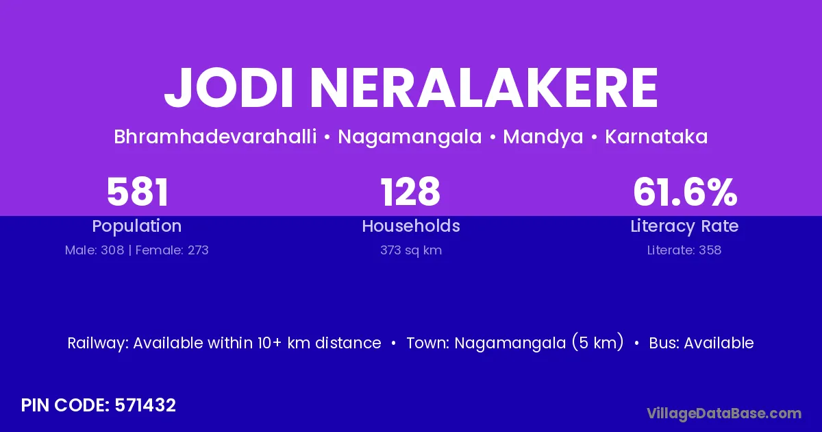 Nagamangala (5 km) is the nearest town to Jodi Neralakere village for major economic activities and is located approximately 5 km away.
