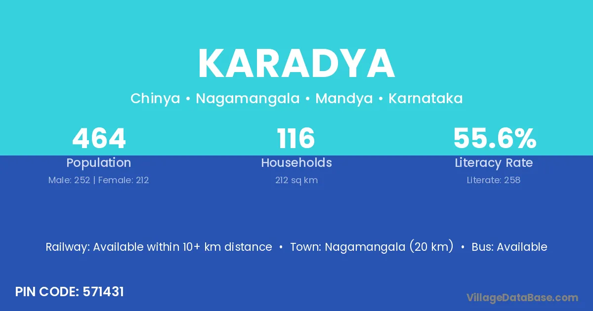 Nagamangala (20 km) is the nearest town to Karadya village for major economic activities and is located approximately 20 km away.