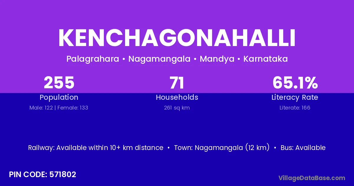 Nagamangala (12 km) is the nearest town to Kenchagonahalli village for major economic activities and is located approximately 12 km away.