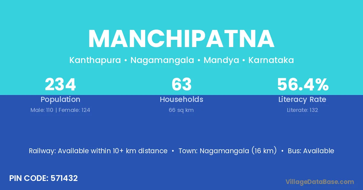 Nagamangala (16 km) is the nearest town to Manchipatna village for major economic activities and is located approximately 16 km away.
