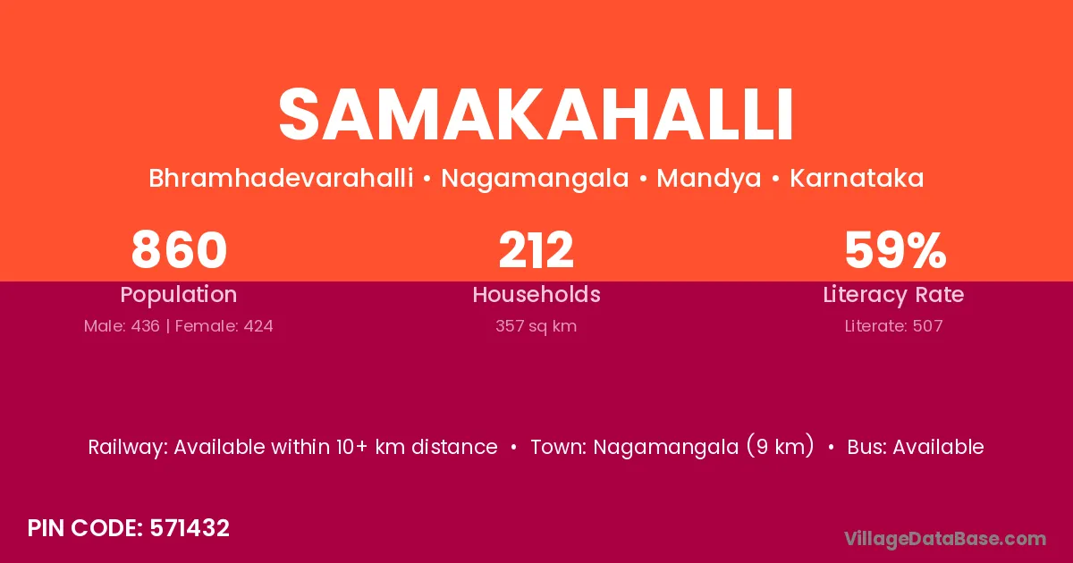 Nagamangala (9 km) is the nearest town to Samakahalli village for major economic activities and is located approximately 9 km away.