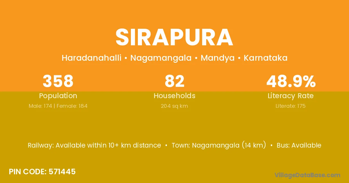 Nagamangala (14 km) is the nearest town to Sirapura village for major economic activities and is located approximately 14 km away.