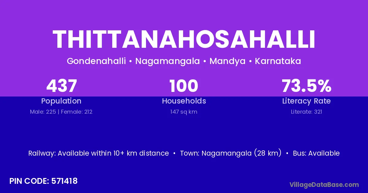 Thittanahosahalli village has a total population of 437 people, of which 225 are males and 212 are females.