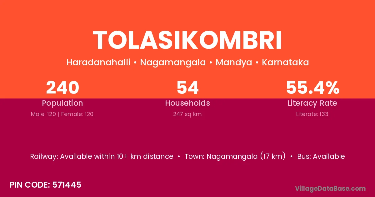 Nagamangala (17 km) is the nearest town to Tolasikombri village for major economic activities and is located approximately 17 km away.