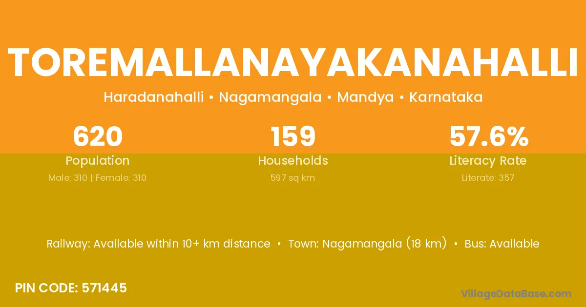 Nagamangala (18 km) is the nearest town to Toremallanayakanahalli village for major economic activities and is located approximately 18 km away.