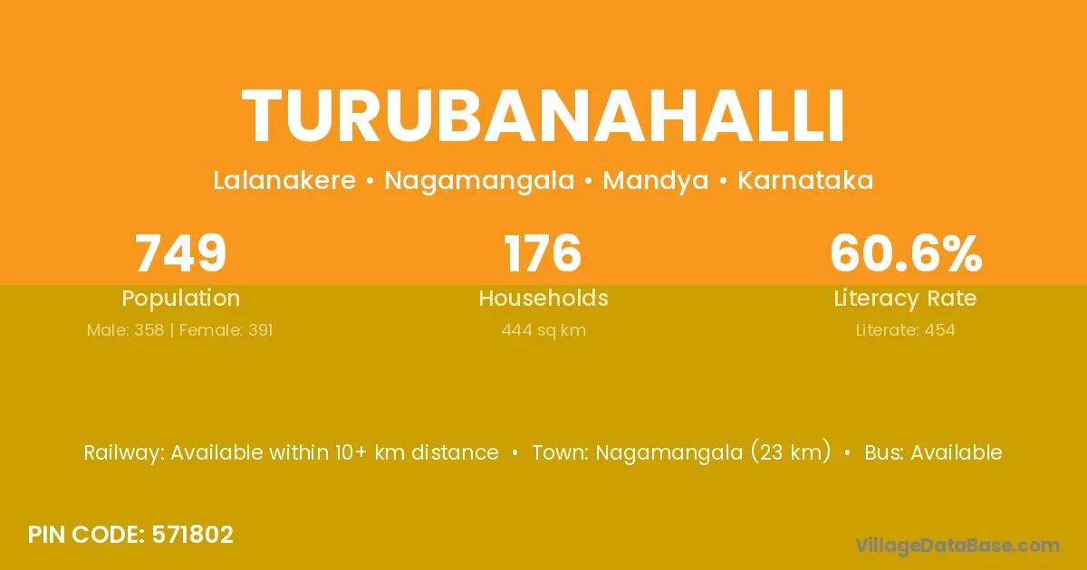Nagamangala (23 km) is the nearest town to Turubanahalli village for major economic activities and is located approximately 23 km away.