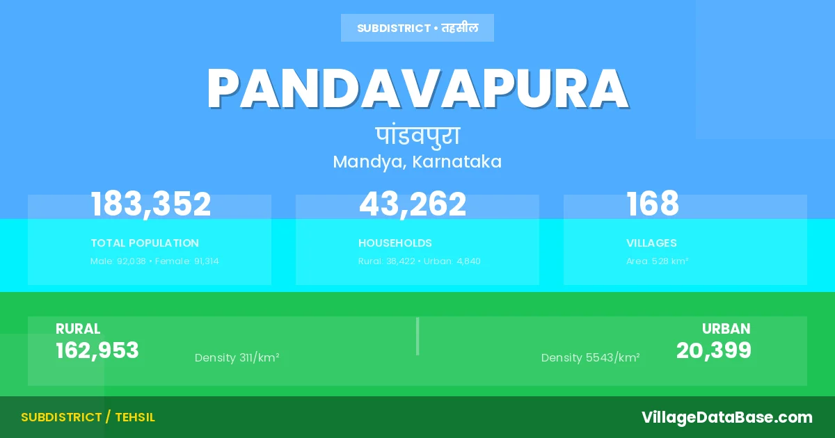 According to the 2011 census The total area of Pandavapura Taluka is 528 km², with a population of 183352 people. The population density is 347 inhabitants per square kilometre, and there are approximately 43262 houses in the sub district.