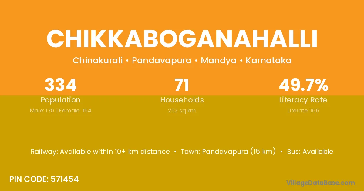 Pandavapura (15 km) is the nearest town to Chikkaboganahalli village for major economic activities and is located approximately 15 km away.