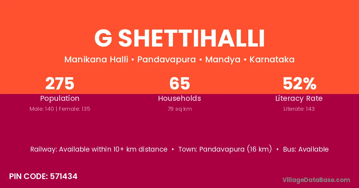 Pandavapura (16 km) is the nearest town to G Shettihalli village for major economic activities and is located approximately 16 km away.