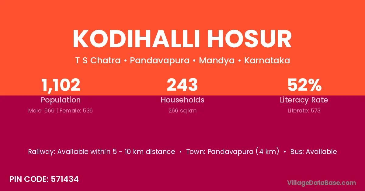 Pandavapura (4 km) is the nearest town to Kodihalli Hosur village for major economic activities and is located approximately 4 km away.