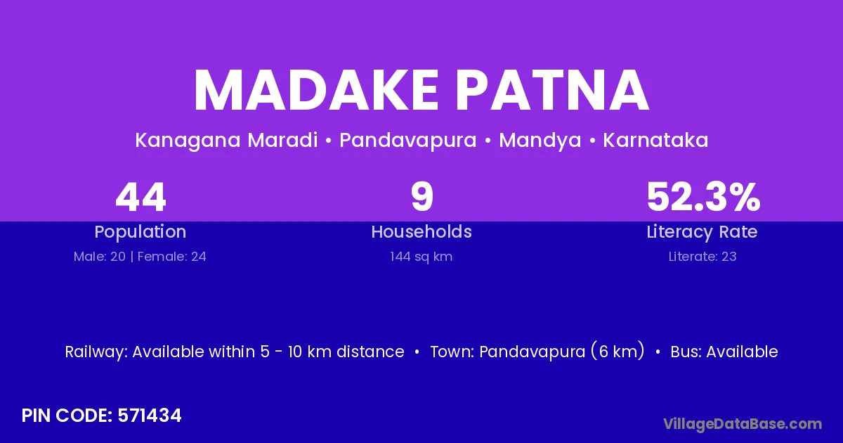 Pandavapura (6 km) is the nearest town to Madake Patna village for major economic activities and is located approximately 6 km away.