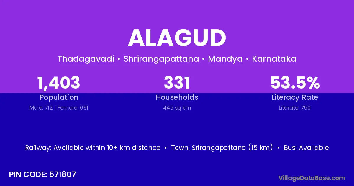 Srirangapattana (15 km) is the nearest town to Alagud village for major economic activities and is located approximately 15 km away.