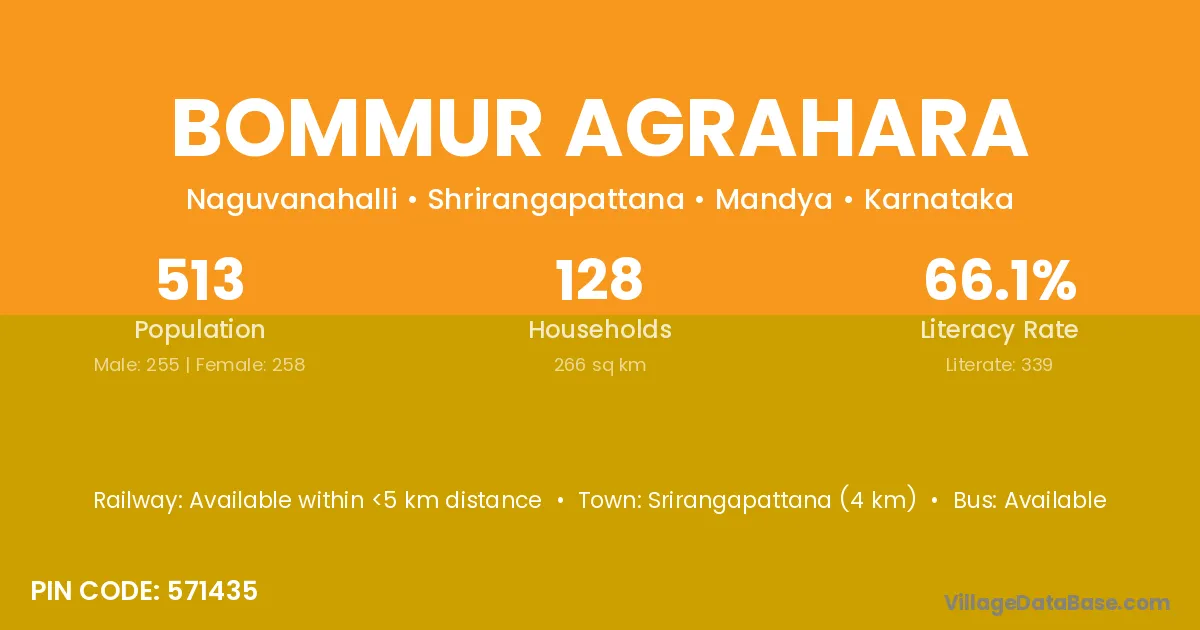 Bommur Agrahara village has a total population of 513 people, of which 255 are males and 258 are females.