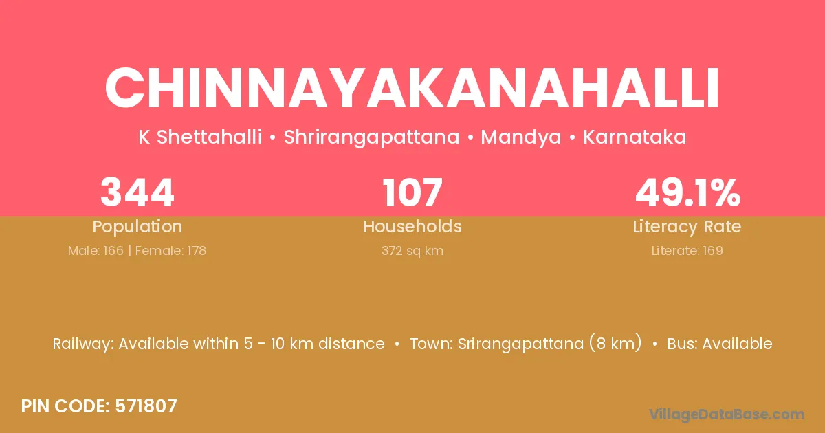 Srirangapattana (8 km) is the nearest town to Chinnayakanahalli village for major economic activities and is located approximately 8 km away.