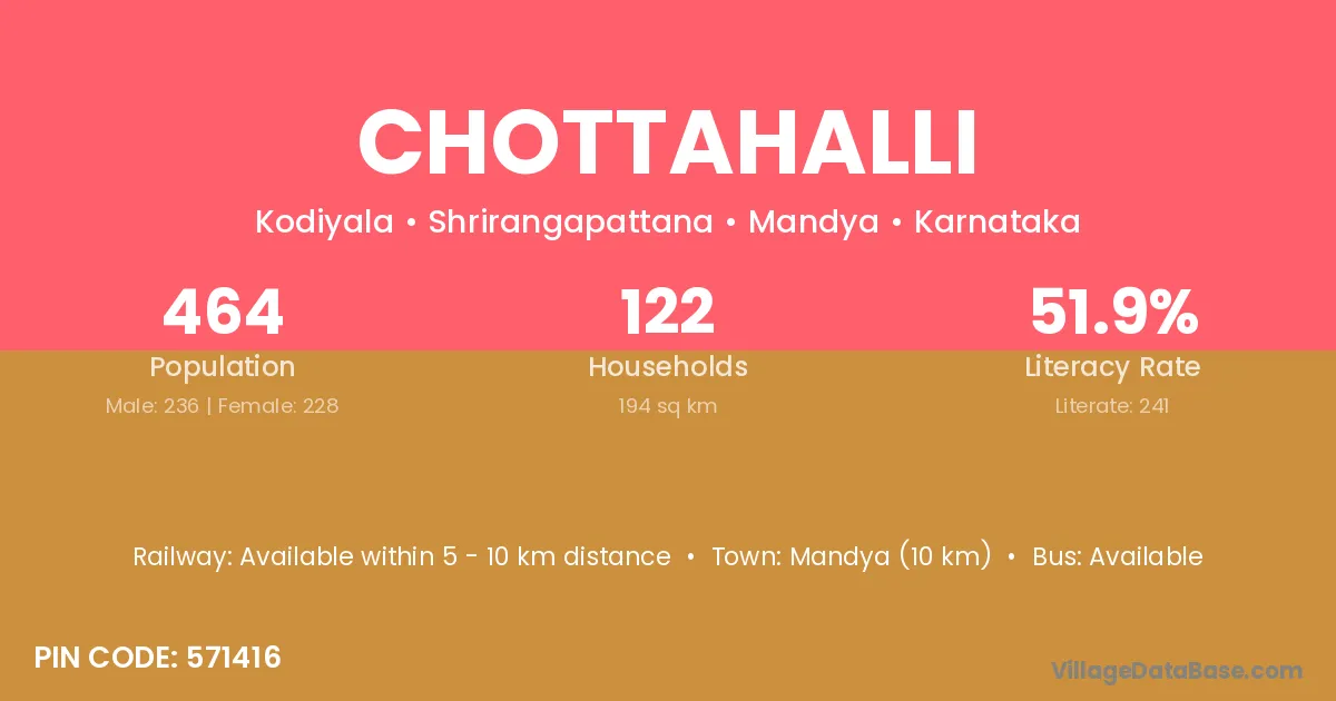 Chottahalli village has a total population of 464 people, of which 236 are males and 228 are females.