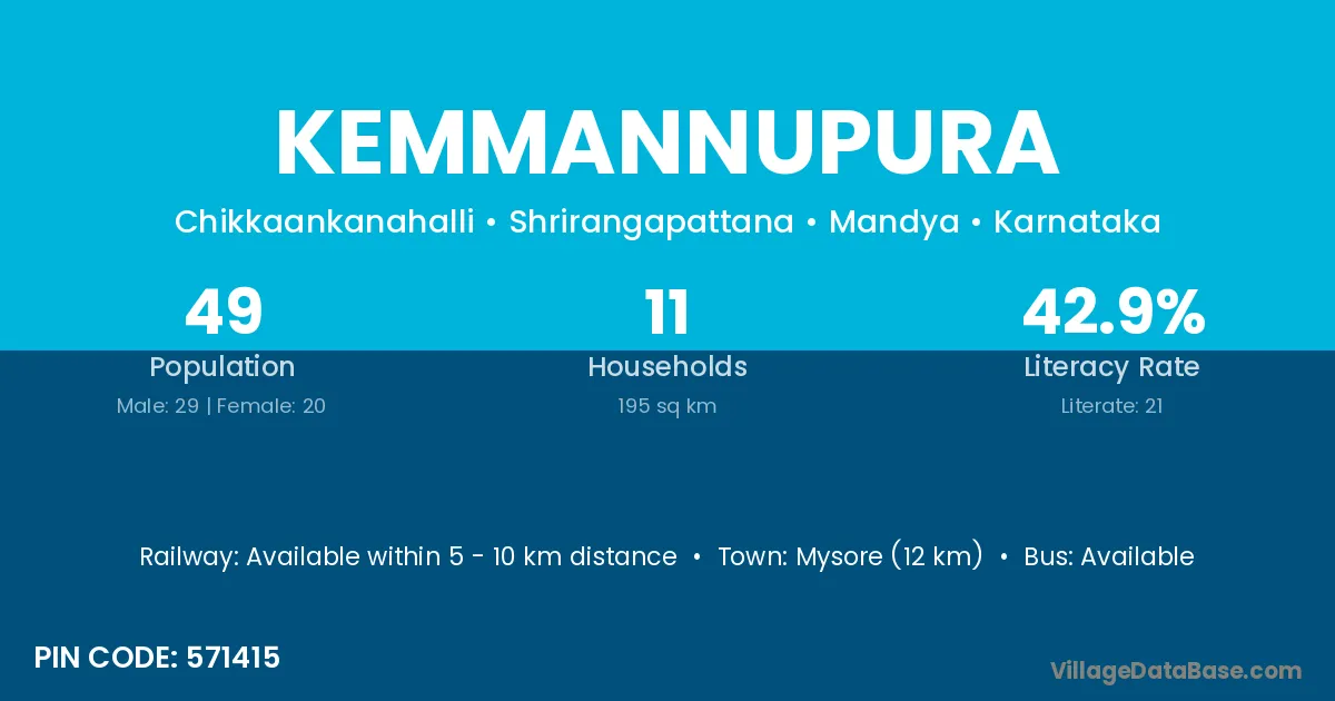 Kemmannupura village has a total population of 49 people, of which 29 are males and 20 are females.