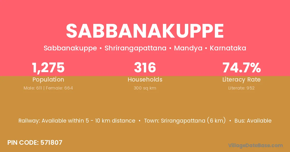 Sabbanakuppe village has a total population of 1,275 people, of which 611 are males and 664 are females.