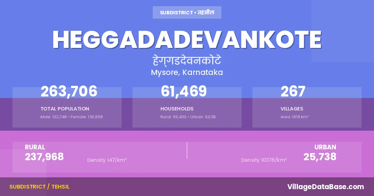According to the 2011 census The total area of Heggadadevankote Taluka is 1618 km², with a population of 263706 people. The population density is 163 inhabitants per square kilometre, and there are approximately 61469 houses in the sub district.