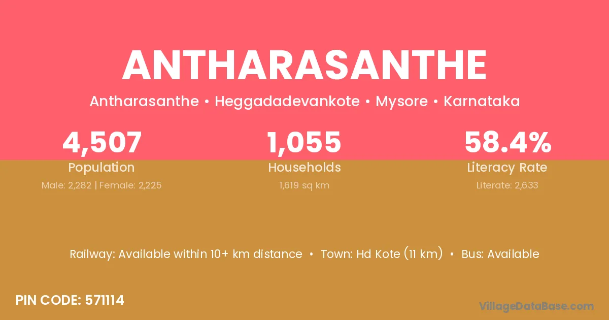 Hd Kote (11 km) is the nearest town to Antharasanthe village for major economic activities and is located approximately 11 km away.