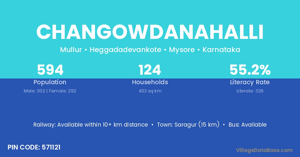 The literacy rate of Changowdanahalli village is 55.22%. Male literacy stands at 64.57% and female literacy at 45.55%.