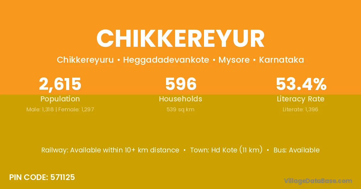 Hd Kote (11 km) is the nearest town to Chikkereyur village for major economic activities and is located approximately 11 km away.