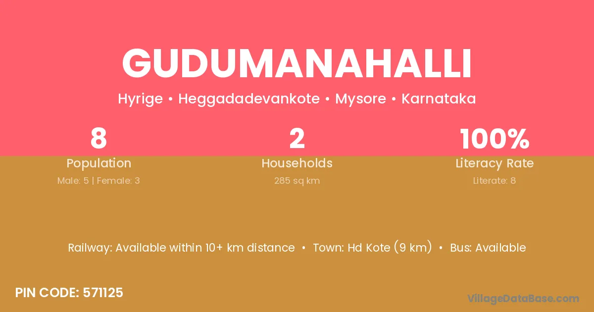 Hd Kote (9 km) is the nearest town to Gudumanahalli village for major economic activities and is located approximately 9 km away.