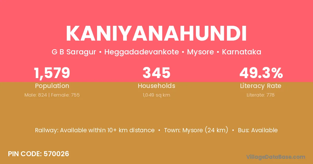 Mysore (24 km) is the nearest town to Kaniyanahundi village for major economic activities and is located approximately 24 km away.