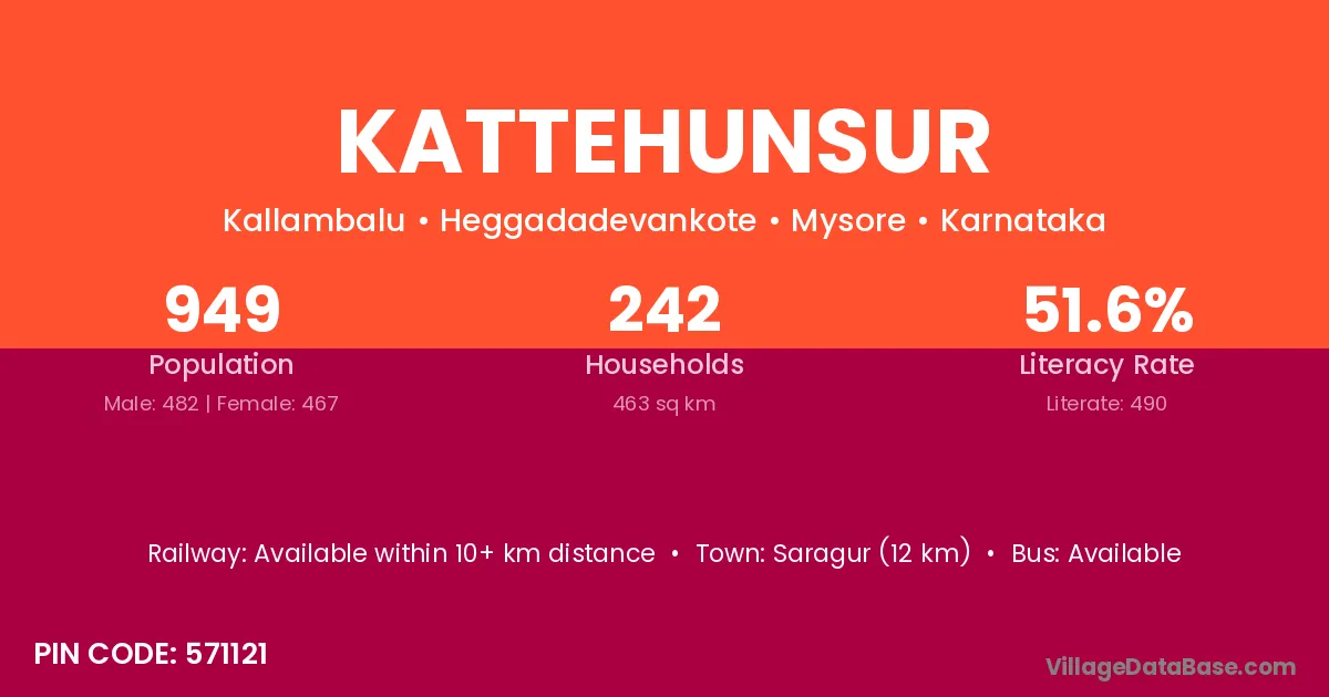 Kattehunsur village has a total population of 949 people, of which 482 are males and 467 are females.