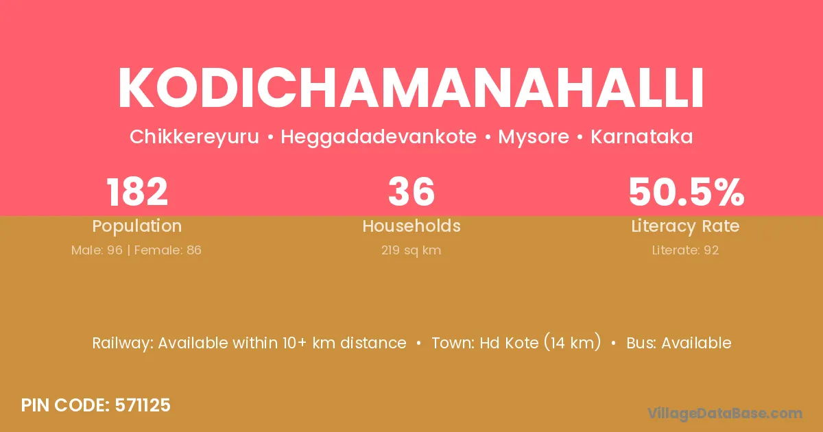 Hd Kote (14 km) is the nearest town to Kodichamanahalli village for major economic activities and is located approximately 14 km away.
