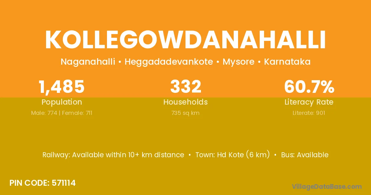 Hd Kote (6 km) is the nearest town to Kollegowdanahalli village for major economic activities and is located approximately 6 km away.