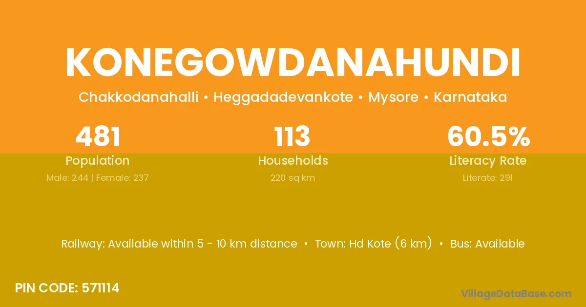 Hd Kote (6 km) is the nearest town to Konegowdanahundi village for major economic activities and is located approximately 6 km away.