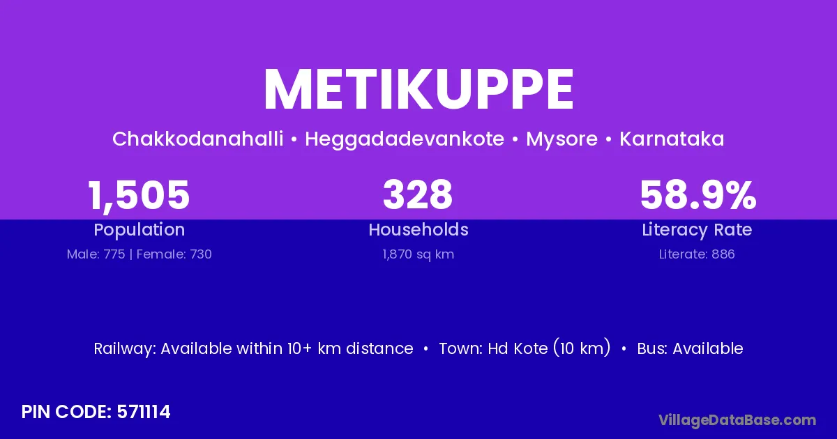 Hd Kote (10 km) is the nearest town to Metikuppe village for major economic activities and is located approximately 10 km away.