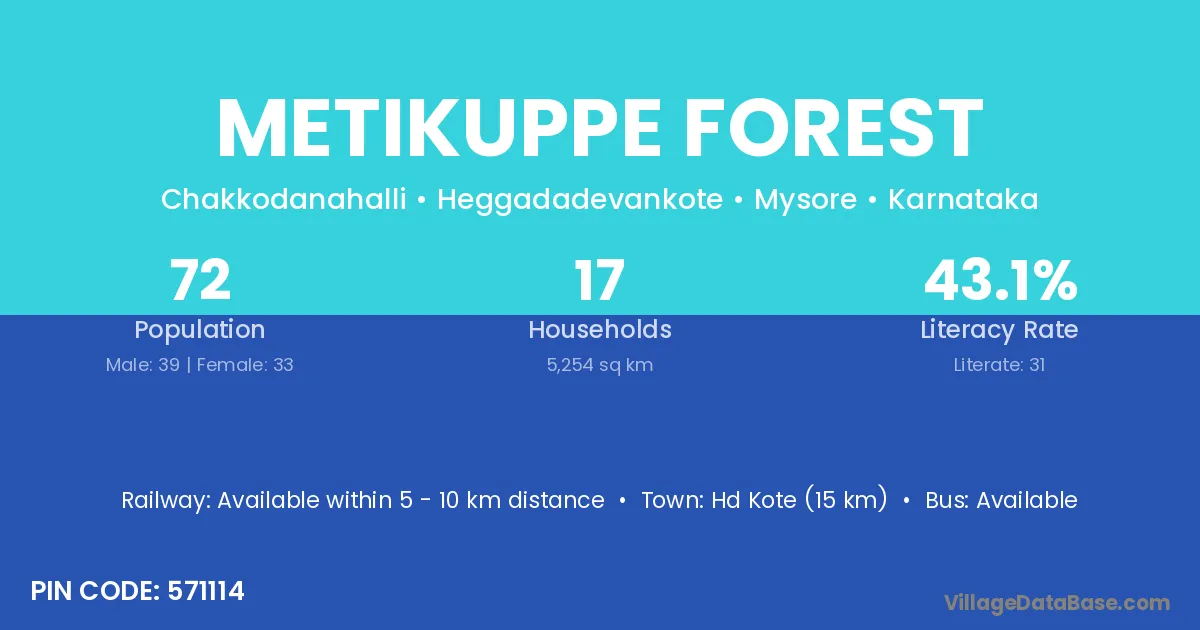 Hd Kote (15 km) is the nearest town to Metikuppe Forest village for major economic activities and is located approximately 15 km away.
