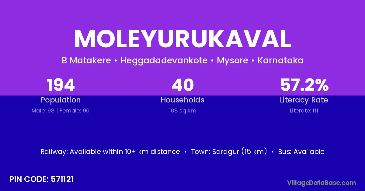 Saragur (15 km) is the nearest town to Moleyurukaval village for major economic activities and is located approximately 15 km away.