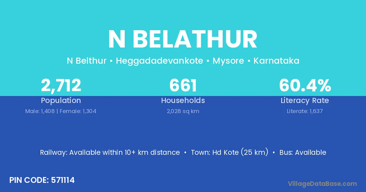 Hd Kote (25 km) is the nearest town to N Belathur village for major economic activities and is located approximately 25 km away.