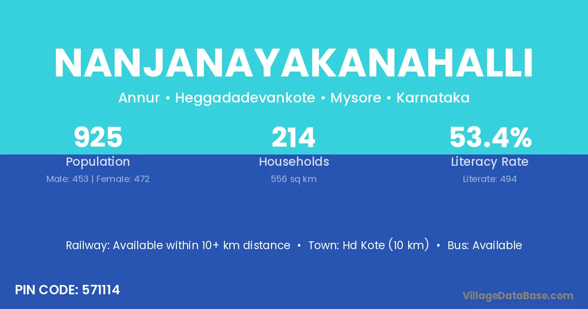 Hd Kote (10 km) is the nearest town to Nanjanayakanahalli village for major economic activities and is located approximately 10 km away.