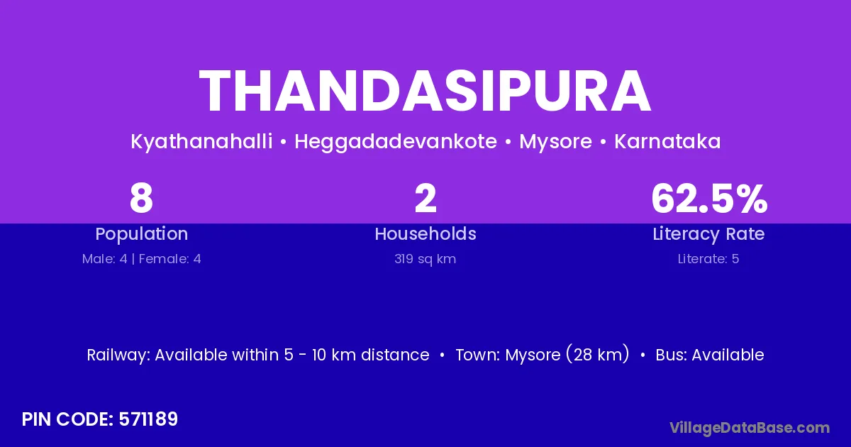 Mysore (28 km) is the nearest town to Thandasipura village for major economic activities and is located approximately 28 km away.