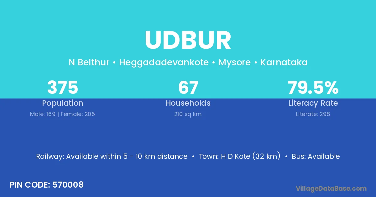 H D Kote (32 km) is the nearest town to Udbur village for major economic activities and is located approximately 32 km away.